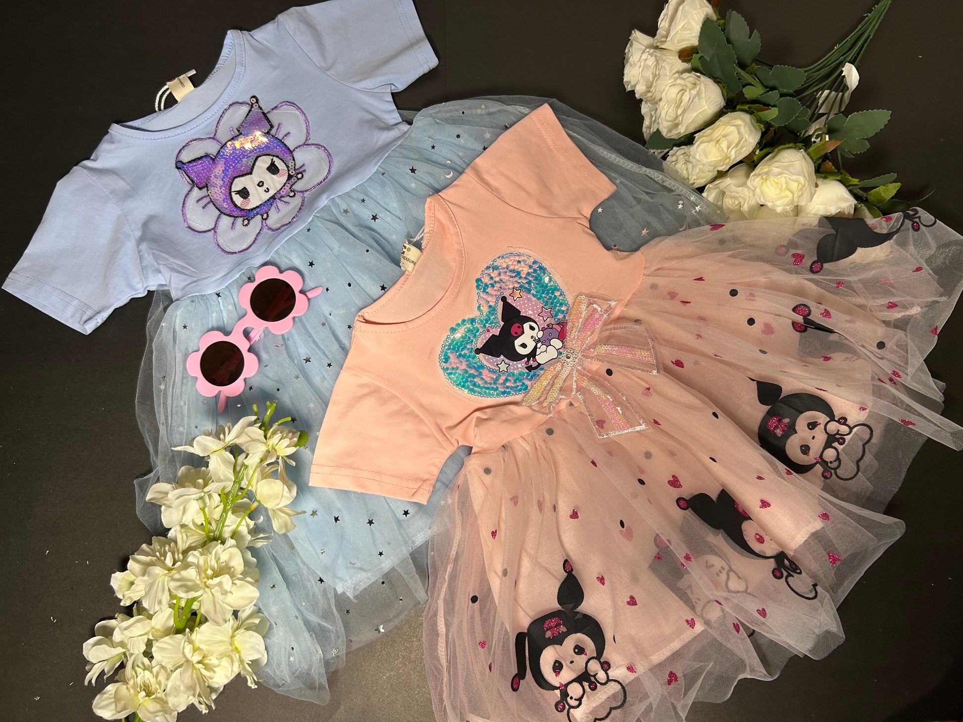 Sparkling Sequin Appliqué: The centerpiece is a large, beautifully detailed flower on the chest. It features a beloved character (similar to Kuromi) with a face made of shimmering, color-shifting sequins that flip and sparkle.
